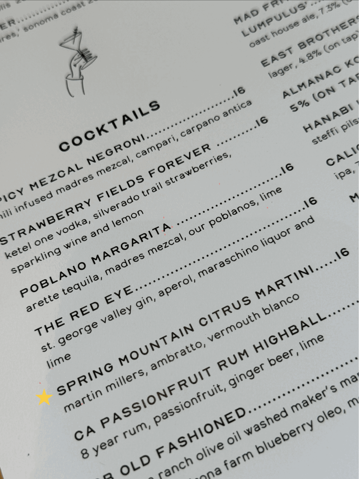 On the drink menu, Spring Mountain citrus shows up in a refined take on a gin martini, and our 1988 Spring Mountain Cabernet Sauvignon is served by the glass, as well as several of our other wines by the bottle.